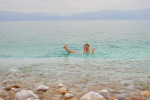 Po takich wędrówkach czas nadszedł na zasłużony relaks w Morzu Martwym. Tu wskazówka praktyczna – niestety parking pod plażą publiczną jest płatny. A pan parkingowy na pytanie czy wie gdzie można zaparkować niedaleko bezpłatnie spojrzał się na nas jak na debili i zapytał "Czy naprawdę sądzicie że odpowiem na takie pytanie? Ja mam dzieci do wykarmienia". Otóż my nie mamy i Wam odpowiemy ;) Zostawcie samochód pod rezerwatem, jest to tylko kawałek, ot, parę minut na piechotę, a miejsca jest pod dostatkiem. Sama plaża tak naprawdę nie jest plażą – strome kamieniste zejście, wejście do wody również po kamieniach, w dodatku z złogami skrystalizowanej soli (uwaga na stopy! Sól tnie skórę nadzwyczaj dobrze ;) ) - ale czy to ważne? Można zobaczyć to piękno krajobrazu i poczuć jedyne i niezapomniane uczucie niezatapialności :D