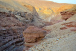 Szybki prysznic i ruszamy dalej. Najpierw krótkie uzupełnienie zapasów o chleb i serek topiony, potem zahaczamy o stację benzynową (i dobrze! Przy granicy Egipskiej ceny paliwa są ponad 1nis tańsze za jeden litr! A normalna cena 7,48 pozostawia wiele do życzenia :/) i jedziemy do Czerwonego kanionu. Nie jest to miejsce szeroko znane, w LP jest tylko jednozdaniowa wzmianka o nim, a było to jedno z najładniejszych miejsc w Izraelu jakie widzieliśmy! Szkoda tylko że byliśmy tuż przed zmrokiem, było już dość ciemno. Mała wskazówka jak tam trafić (ciężko znaleźć to info) – 19km za ostatnim rondem w Eilacie jadąc drogą 12 po prawej stronie będzie mała tabliczka – należy skręcić w prawo w pustynną drogę i jechać nią ok 1,5km i jesteśmy na miejscu. Są możliwe dwie trasy (kółka), jedna krótka, do zrobienia w 45min, druga na o ile pamiętam 4h.