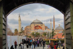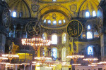 Niebieski meczet/Sultanahmet. Jest wielki, jednak to nie jego rozmiary, a wyjątkowa harmonia architektury utkwi w pamięci – choć wybudowany na początku XVII wieku na mnie osobiście zrobił większe wrażenie niż Hagia Sofia. Hagia Sofia – najbardziej znana świątynia, wybudowana jako VI wieczny kościół, służąca przez prawie 500 lat za meczet, obecnie muzeum. Na pierwszy rzut oka z zewnątrz nie aż tak imponująca – do czasu aż człowiek nie uświadomi sobie z którego wieku jest to budowla. A potem wchodzi się do wnętrza – a tam czeka magia. Pałaca Topkapı – siedziba sułtanów. Ciekawe skarbce, fajny harem. Ale najlepszy jest widok na Bosfor